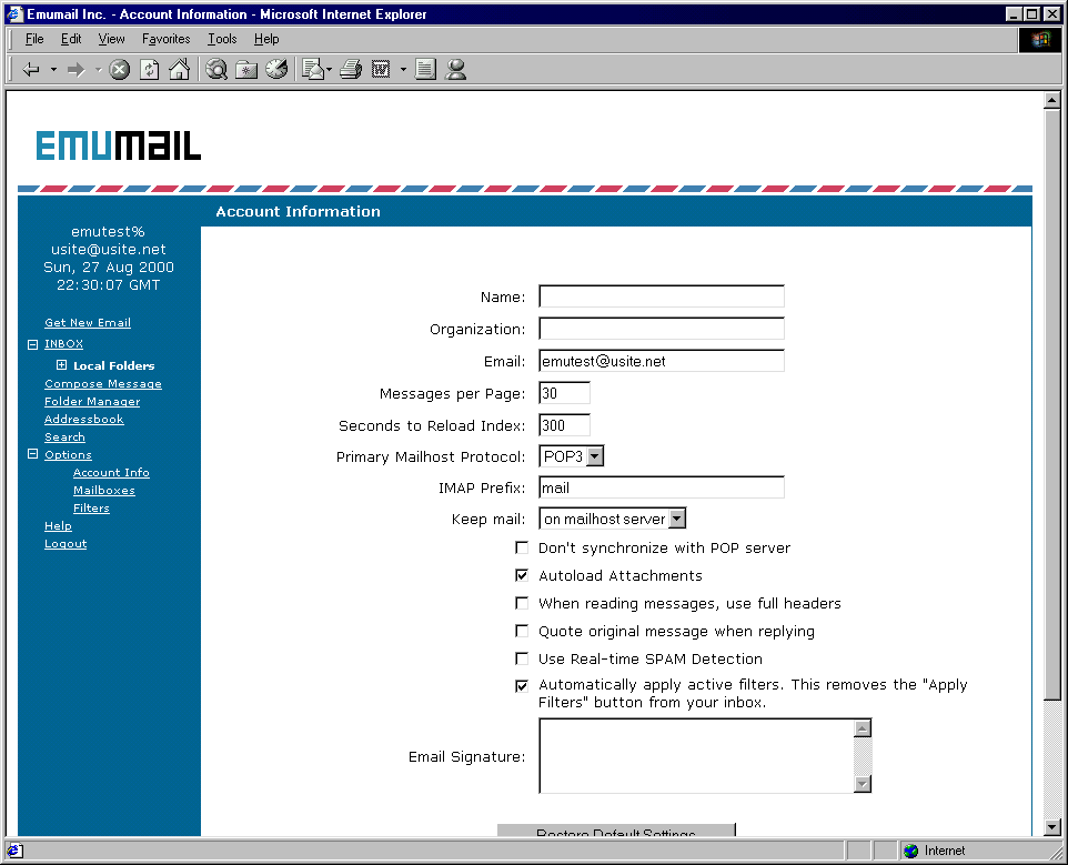 Restoring the default settings sets the following: Name and Organization -> blank; Email -> full email you logged into EMU Webmail with; Messages per Page -> 30; Seconds to Reload Index -> 300; Primary Mailhost Protocol -> whichever protocol EMU Webmail detects your account's server supports; IMAP Prefix -> blank; Keep mail -> on mailhost server; Autoload Attachments and Quote original message when replying and Automatically apply active filters -> checked off; Email Signature -> blank. |