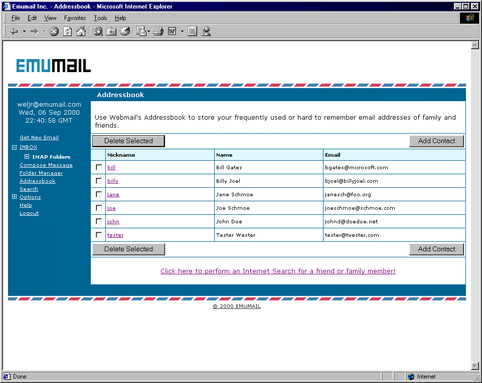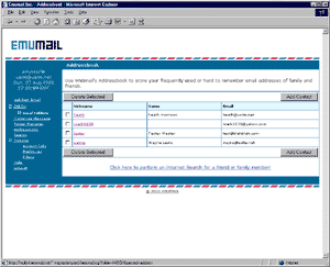 To delete an entry in the Addressbook, check on the box to the left of the entry, and click "Delete Selected". You can remove multiple entries at one time by checking more than one box. |