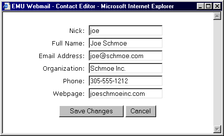 This takes you to the Addressbook Contact Editor. After typing in a Nickname, Full Name, and Email Address, you can click "Save Changes" to add the entry to your Addressbook. |